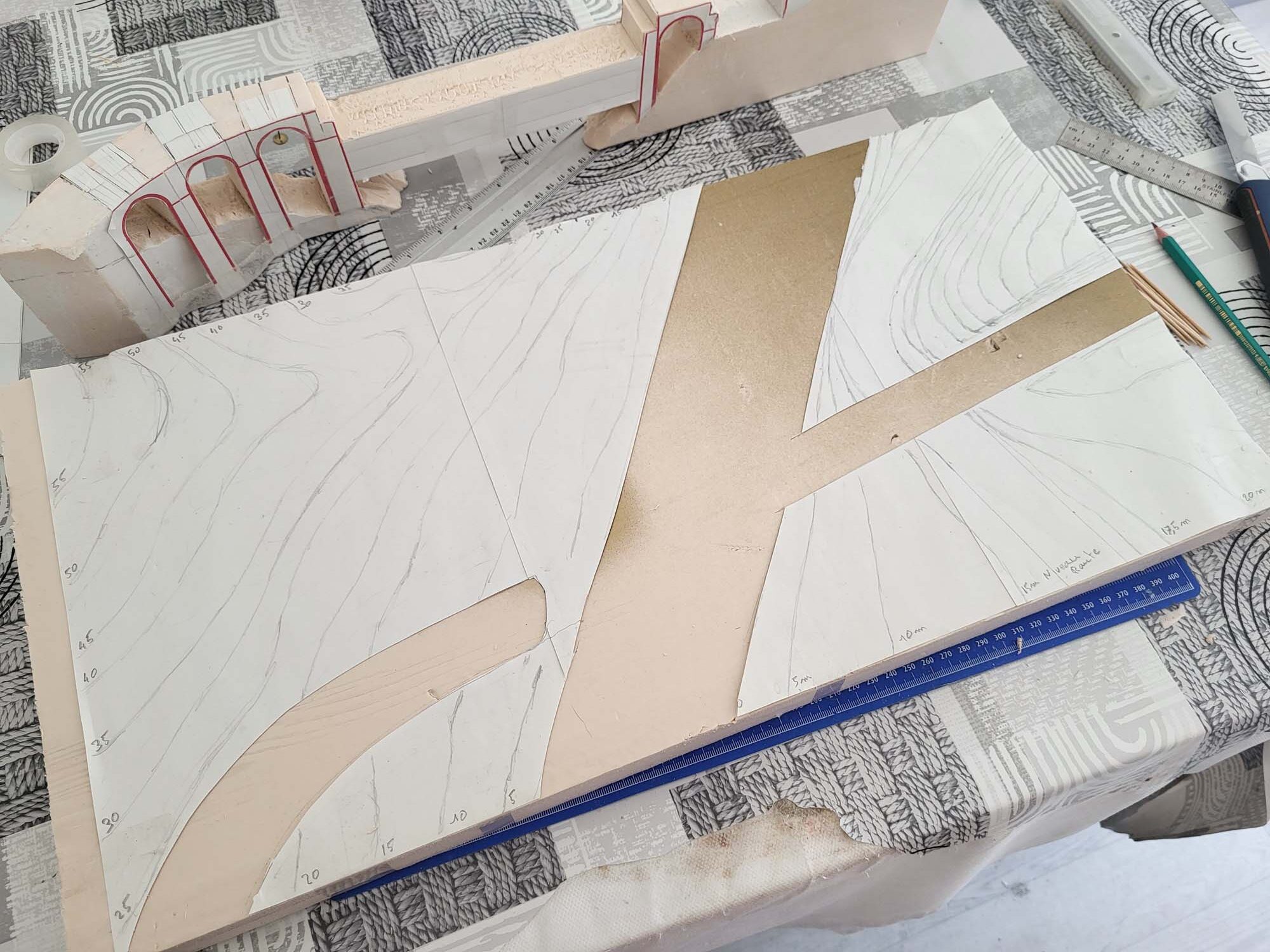 C’est ici que le diorama prend vie. En empilant des blocs de polystyrène extrudé, je crée d’abord une structure en “escalier” que je viens ensuite affiner.