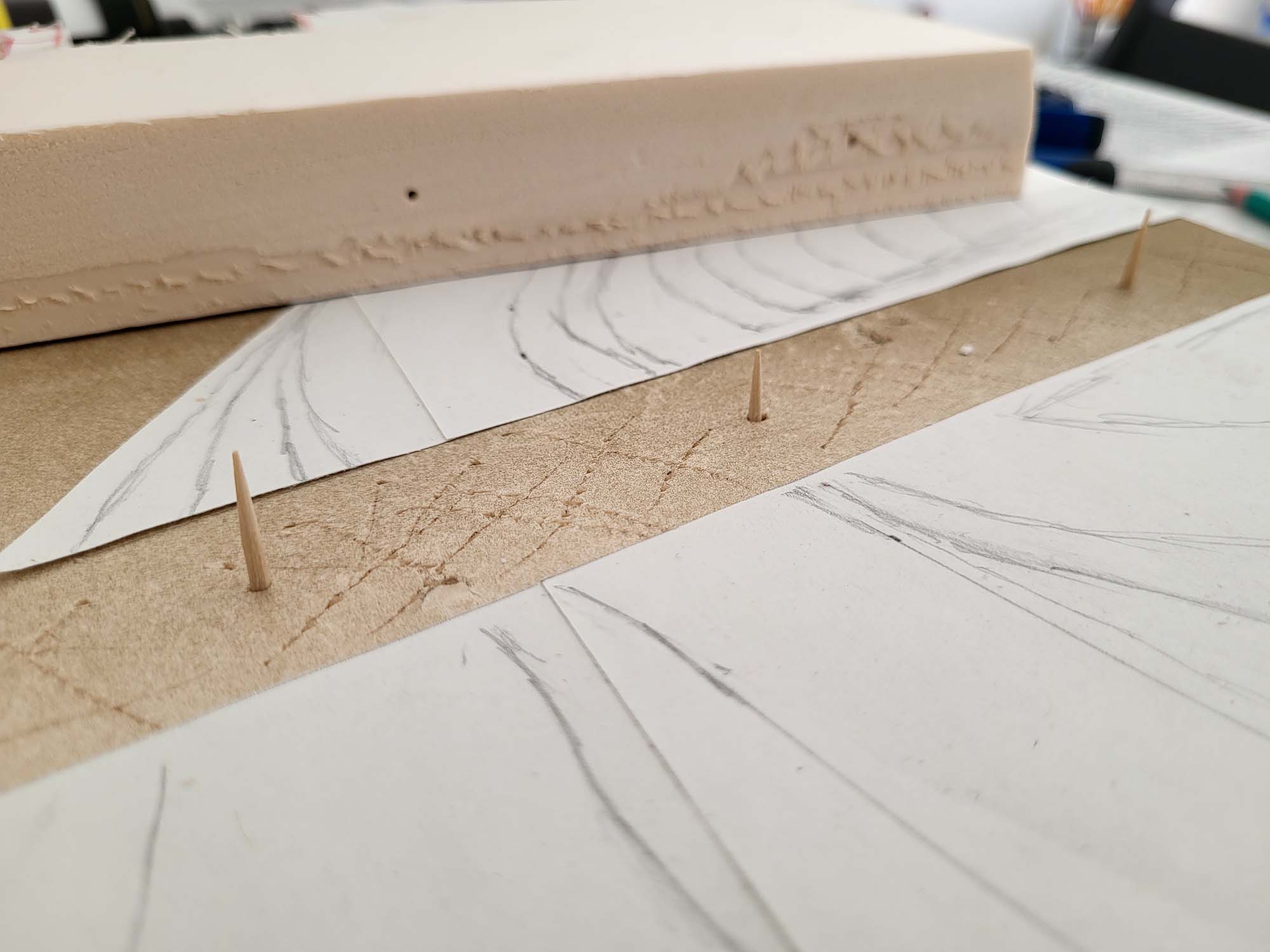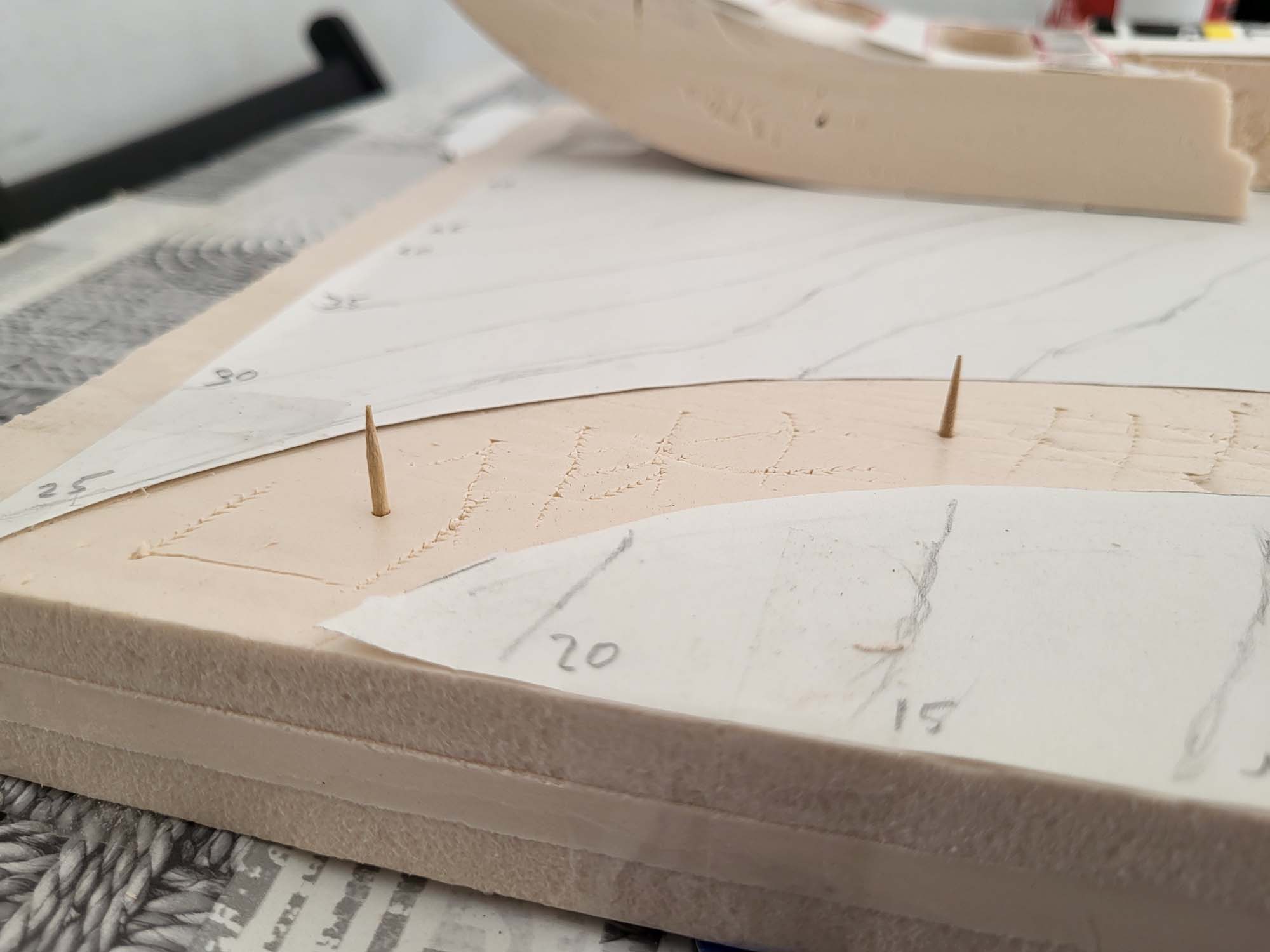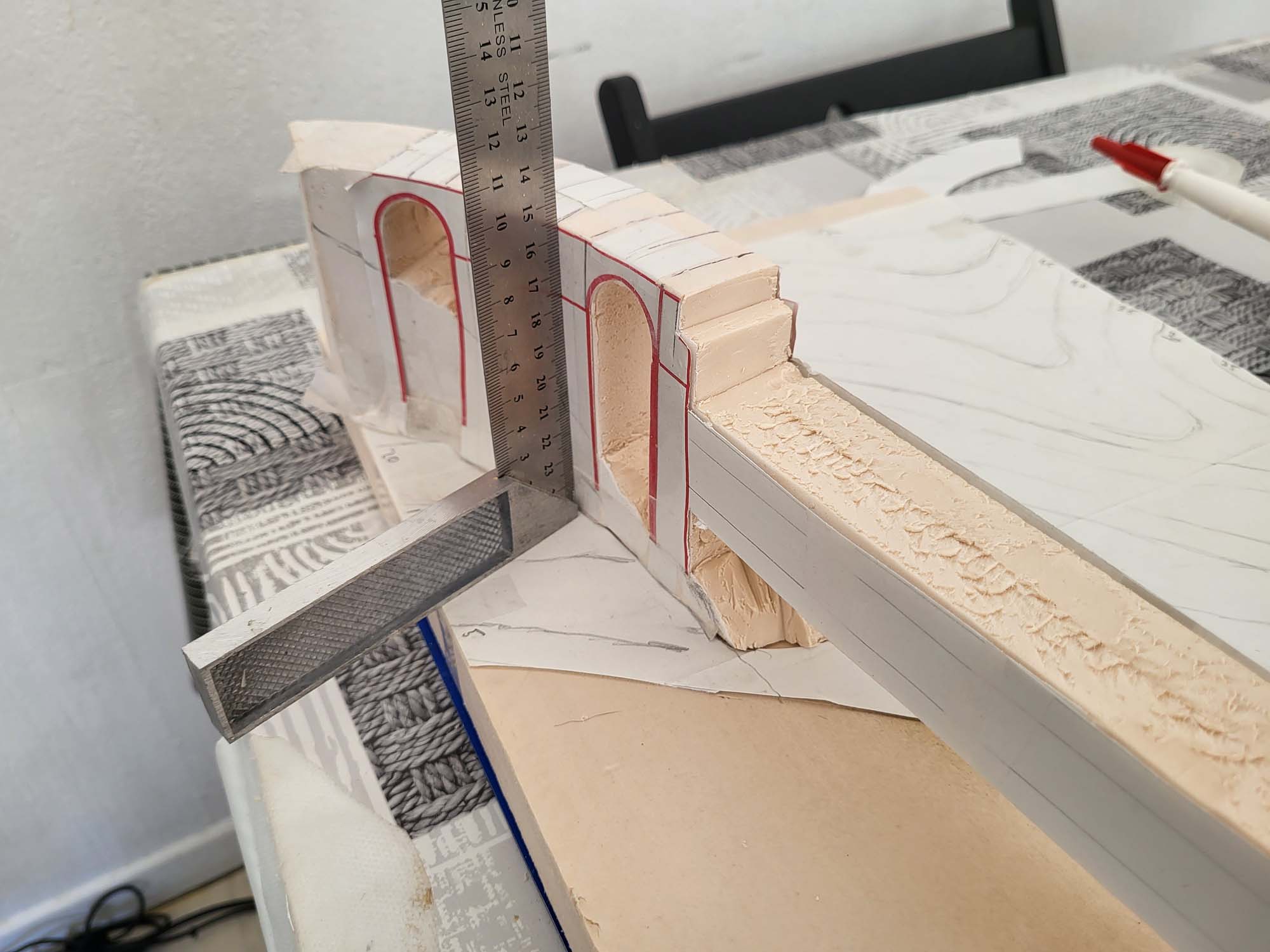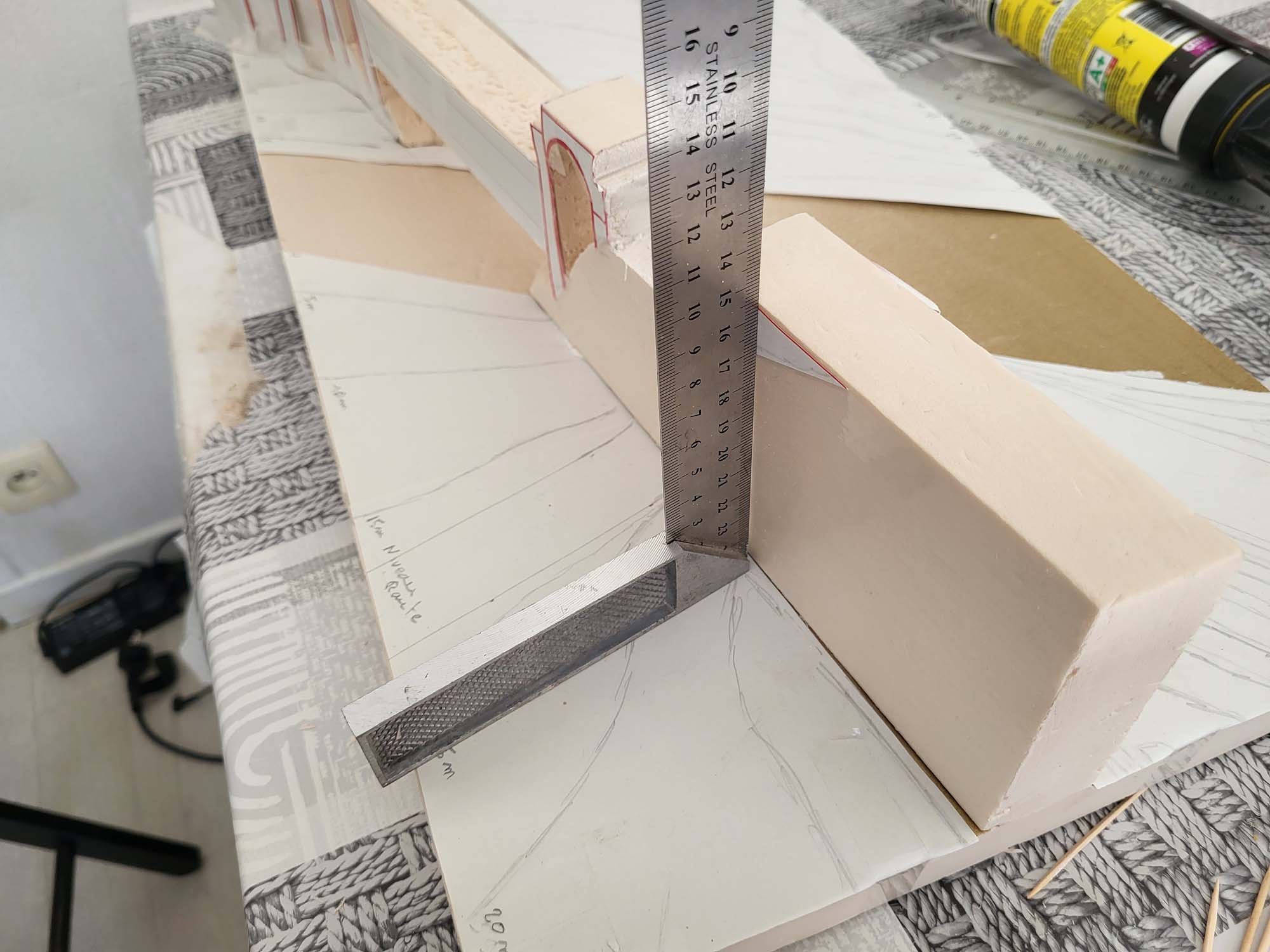 Avant d’attaquer la sculpture pure, la première étape consiste à fixer les bases structurelles. J’ai procédé au collage des arches sur le support en bois. Cette phase est cruciale : l’alignement doit être parfait pour garantir la continuité de la voie ferrée. Comme on peut le voir sur les photos, j’utilise des cales et des poids pour maintenir une pression uniforme durant le séchage.
